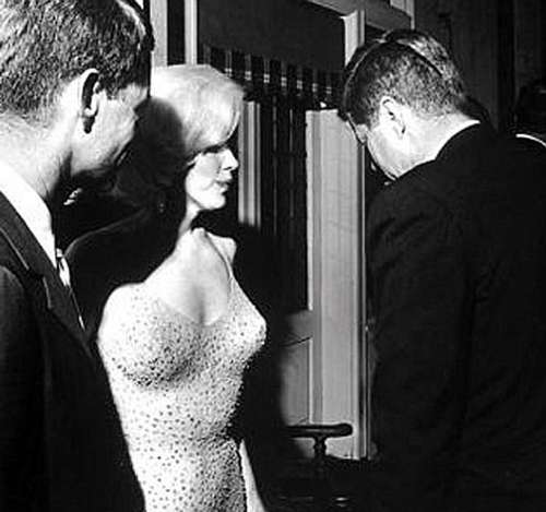 1962年5月19日,為慶?夏岬峡偨y(tǒng)即將到來的生日,瑪麗蓮-夢露身穿綴滿亮片的露背晚禮服,在紐約麥迪遜花園廣場獻(xiàn)唱了一首甜蜜的《總統(tǒng)先生,生日快樂》。演唱結(jié)束后,白宮攝影師塞西爾-斯托頓抓拍到一張瑪麗蓮夢露與肯尼迪兄弟的合影。