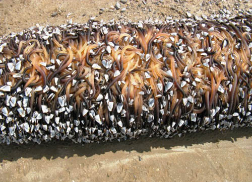 度假游客麗貝卡・波特以為自己看見了“一只活生生的大海怪”。她說:“它有兩米長,像電線桿子那么粗”,“事實上它們可能是我見過的最大型的飄浮的狗爪螺(又稱茗荷兒,鵝頸形藤壺)標本”。經專家驗證后,這個所謂的異星怪物原來是不計其數的狗爪螺。它們原本生活在海洋深處,受壞天氣影響從海里翻涌出來,并密密麻麻地附著在一塊木頭上隨波逐流,最終到達海灘,才成了這副模樣。