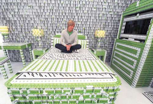 洲際酒店集團為宣傳假日酒店的一家分店在翻新后重新開幕,委托伯格為在紐約建造這家“鎖匙卡酒店”。它已在17日開幕,只會經營5天。全店只有一個睡房、一個浴室和一個大堂,面積只有約37平方米,重量只有兩噸。但它的賣點在于伯格那瘋狂的創意和手藝:店內的睡床、接待處、桌椅……所有的家俬都是由酒店鎖匙卡搭成,體積與一般家俬無異。