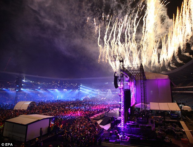 演唱會由傳統(tǒng)的非洲舞曲拉開序幕。之后美國樂隊黑眼豆豆一襲角斗士扮相登上舞臺,為觀眾送上三首經(jīng)典曲目,引爆全場熱情。