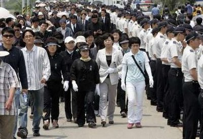 中新網5月26日電 韓國慶尚南道金海市峰下村25日的白天最高氣溫達到了30度,當天是韓國前總統盧武鉉逝世的第三天。從村子入口通往盧武鉉靈堂的兩公里長雙向2車道公路上,沒有一點兒背陰處。由于警方在村口阻止車輛進入,市民們只能頭頂報紙、手帕、草帽,在往返需要一小時的炎熱的柏油路上步行前往焚香所。很多人即使汗如雨下也沒有脫掉黑色的西服上衣。