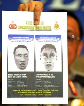 中新網7月22日電 綜合外電消息,印尼警方22日公布了上周豪華酒店爆炸案中兩名自殺式襲擊者的面部合成照片。
