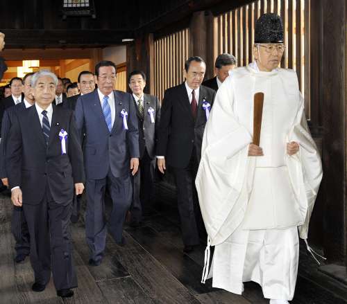 中新網10月21日電 最近幾天,日本政界人士紛紛前往參拜靖國神社。19日,自民黨總裁谷垣禎一進行了參拜,并稱“不僅是二戰,這里也祭祀著很多近代史上死去的人。是慰撫這些亡靈的心情”。20日上午,日本跨黨派議員團體“大家一起參拜靖國神社國會議員會”的成員——包括日本眾院副議長衛藤征士郎在內的54名眾參兩院議員參拜了靖國神社。