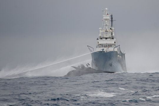 負責捕鯨任務的日本鯨類研究所指責“海上牧者”試圖以快艇高速接近、拋擲繩索的方式絞住捕鯨船的推進器。