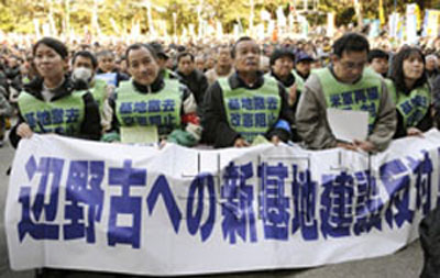 現行計劃中的搬遷地點、沖繩縣名護市新當選的市長稻嶺進也向集會發來了表達共同愿望的信息。市民團體“直升機基地反對協議會”的共同代表安次富浩表示:“鳩山由紀夫首相說將把名護市長選舉的結果作為判斷材料,我們取得了勝利。沒有比這更能代表民意的了。”