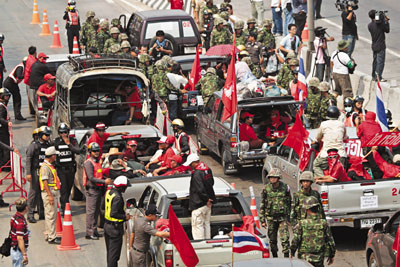 泰國政府原規定不準外府紅衫軍駕車入城,以免造成交通堵塞,但紅衫軍拒絕了政府軍警安保人員的要求,軍警為避免和示威者發生對抗,最后讓紅衫軍一路開車長驅直入曼谷市區。