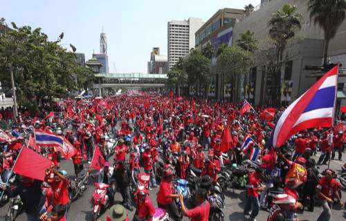 紅衫軍在旅游熱點四面佛附近架起講臺集會,他們站滿馬路、天橋和百貨公司前的廣場,領袖揚言徹夜示威,直至重新大選。