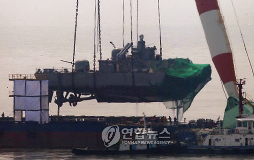 中新網(wǎng)4月15日電 據(jù)韓聯(lián)社報道,韓國“天安”艦艦尾的打撈工作15日進行。由韓國軍方和民間組成的打撈工作組,15日下午1時14分利用大型起重機,將“天安”艦船尾打撈出水后,成功放置在駁船上。