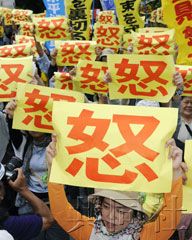 沖繩縣政府大樓前爆發了抗議美軍普天間機場遷至縣內的集會,參加者們高舉“怒”字標語牌。圖據日本共同社