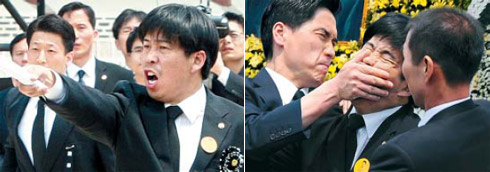 韓國《朝鮮日報》報道,那一瞬間,李明博顯得非常驚慌,回頭看了一眼,但還是完成獻花,默默回到座位。