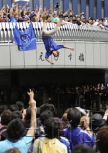 報(bào)道稱,大批身著日本隊(duì)藍(lán)色隊(duì)服的球迷涌上街頭占據(jù)了十字路口,甚至還有球迷跳入河中用這種奇特的方式慶祝勝利。比賽結(jié)束約20分鐘后,第一名球迷跳入河中,隨后又有50余人高呼萬歲跳進(jìn)河里,連早有防備的在場(chǎng)警察也無法勸阻。