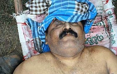 斯里蘭卡國家電視臺播放的錄像畫面顯示,一個看上去很像是泰米爾猛虎反叛組織領袖的尸體,身穿迷彩服,頭的頂部蓋著一塊布,顯然是遮掩一個傷口。