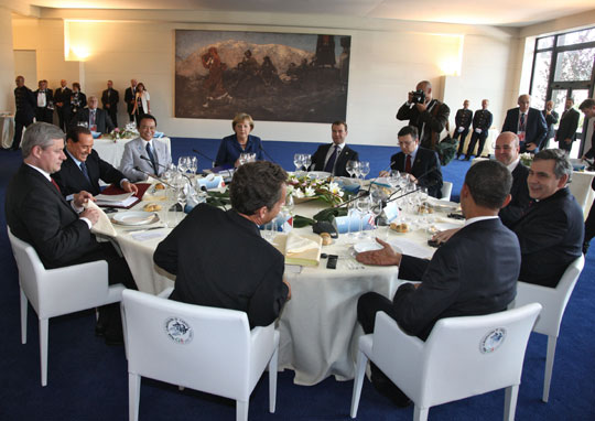 當(dāng)前八國集團(tuán)的輪值主席是意大利總理貝盧斯科尼。八國集團(tuán)領(lǐng)導(dǎo)人將舉行工作會議,就核不擴(kuò)散、反恐以及阿富汗、伊朗和中東問題等廣泛的全球性議題進(jìn)行磋商。本屆峰會期間,八國集團(tuán)將在貿(mào)易問題上與中國、巴西、印度、墨西哥和南非等發(fā)展中五國以及埃及展開商談。