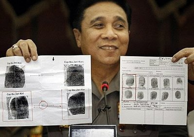 印尼警察總長在新聞發布會上展示努爾丁的指紋對比。