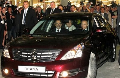中新網(wǎng)6月3日電 日本日產(chǎn)公司在圣彼得堡設立的新工廠向參加工廠開幕式的來賓展示了該廠生產(chǎn)的日產(chǎn)天籟(Nissan Teana)車。俄羅斯總理普京2日坐到這輛車的駕駛員位置上,開車帶該廠廠長兜了一圈。