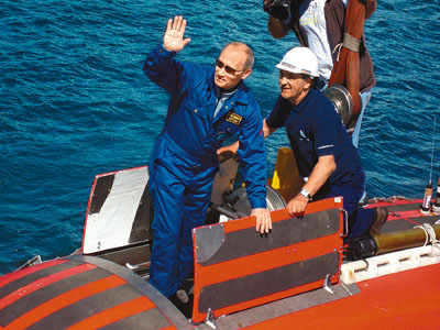 根據(jù)國營電視臺(tái)發(fā)出的照片,可見身為柔道黑帶高手的普京身穿藍(lán)色工作服,攀上Mir-1潛艇開始航程。普京在船艙表示:“這次潛水很順利,視野在燈光下很好!钡麑(duì)水顯得污濁有微言:“從生態(tài)角度看這些水當(dāng)然干凈,但事實(shí)上這是浮游生物湯,起碼我是這樣叫它!