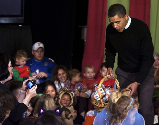 雖然奧巴馬與夫人米歇爾沒有特殊打扮,但親自向小客人分發糖果。兩人稍后還與副總統拜登夫婦接見軍人及白宮職員家眷,共度萬圣節。