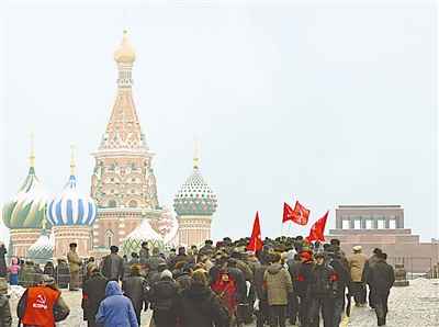 1月21日,在俄羅斯首都莫斯科,數(shù)百名俄共黨員及普通民眾排隊向紅場邊的列寧墓獻花圈。當日,數(shù)百名俄共黨員及普通民眾舉行活動,紀念列寧逝世85周年。