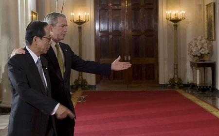 在兩個(gè)人都很為難的時(shí)候,福田明白,他這次如果再要求布什把“綁架日本人問題”與美朝關(guān)系捆綁在一起,就是大大地“不識(shí)相了”。布什也是心領(lǐng)神會(huì),只不過面對(duì)記者,慷慨激昂地表示了一下“我們不會(huì)忘記‘綁架被害者家屬’”,而不作任何實(shí)質(zhì)性承諾。