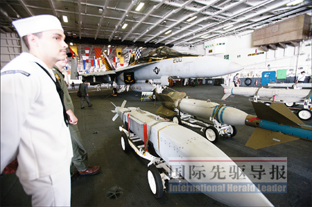 在飛行甲板上,一位名叫馬圭爾的海軍軍官向《國際先驅導報》記者介紹了艦上的艦載機。從EA-6B“徘徊者”電子戰飛機到E-2C“鷹眼”空中預警機,從SH-60“海鷹”直升機到F/A-18“大黃蜂”的各種改進型,他如數家珍。