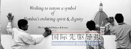孟買泰姬陵酒店外墻張貼海報為酒店重建做宣傳:“為了恢復孟買不朽精神與榮耀的象征而努力”。