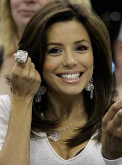 “絕望主婦”伊娃·朗格莉亞日前助陣丈夫托尼·帕克所屬馬刺隊和開拓者隊的NBA常規(guī)賽。場邊的她除了為老公充當(dāng)拉拉隊外,還不時拿起托尼碩大的2007NBA總冠軍指環(huán),朝著媒體鏡頭得意地大秀一番。