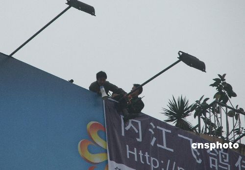 11月11日上午,在四川省內江市東興區西林大橋橋頭一七層高樓外的廣告牌上,一青年男子利用手中擴音喇叭高喊“因工作失意,欲一死了之”,很快吸引了數百名群眾。趕到現場的派出所民警和消防戰士將其成功解救。