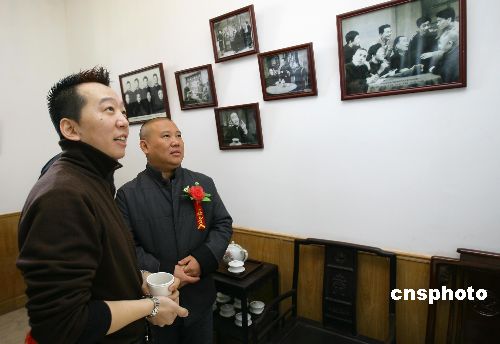 圖為郭德綱和侯寶林先生的孫子候軍在侯寶林故居觀看老照片。