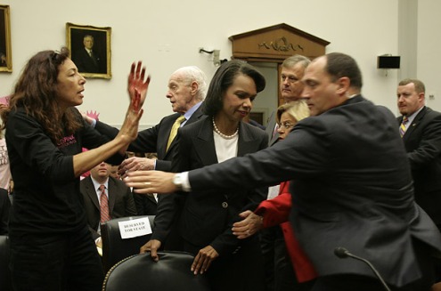 美國國務卿賴斯在國會作證時遭抗議。