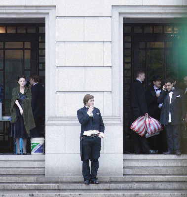 由于音樂廳四個門口都有劇組的工作人員嚴格控制進出人員,而導演陳凱歌,主演黎明、孫紅雷又都是經過地下停車場直接進入音樂廳內部,所以早報記者只是從工作人員處獲悉,當外籍演員都在兩側邊門抽煙聊天時,黎明正在音樂廳內上妝。據消息人士透露,為了昨日這場戲,黎明早在北京拍攝時就開始準備,而且為了符合梅蘭芳去百老匯時的體態,黎明還特意增肥,使臉龐看起來圓潤一些,更貌似梅蘭芳。 記者 劉嘉琦