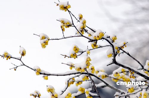 1月19日,安徽淮北相山公園內數株盛開的臘梅,在冰雪映襯下十分嬌艷。中新社發 泰峰 攝