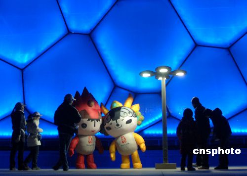 眾多民眾前來觀賽與福娃一起與水立方親密接觸。中新社發 廖攀 攝