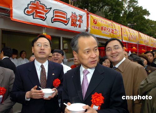圖為中國駐日大使崔天凱(中)和中國駐名古屋總領事李天然(左)在老三餃子展臺前品嘗中國餃子。