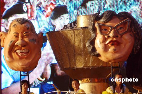 2007年,香港明星曾志偉、沈殿霞的大頭像出現在深圳世界之窗舉行的“花開正十年”大型聯歡晚會巡游行列中。中新社發 陳文 攝