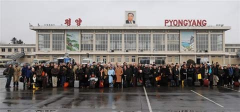 美國紐約愛樂樂團成員抵達朝鮮首都平壤后合影。