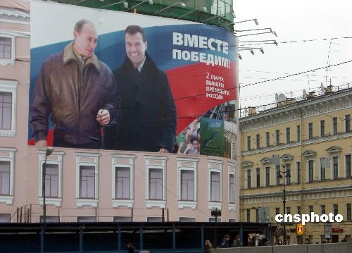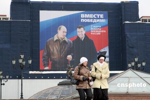 3月1日,在莫斯科紅場旁邊,現(xiàn)任俄羅斯總統(tǒng)普京與政府第一副總理、下屆總統(tǒng)的熱門侯選人梅德韋杰夫的巨幅海報,上書“我們攜手贏取勝利”十分醒目。梅德韋杰夫曾多次表示,他若當(dāng)選后將繼續(xù)執(zhí)行普京路線。3月2日,俄羅斯將舉行總統(tǒng)大選。中新社發(fā) 田冰 攝