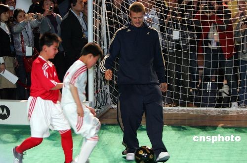 3月3日,足壇巨星貝克漢姆在上海出席中國球迷見面會,并與在滬進城務工子弟“交流球技”。中新社發(fā) 湯彥俊 攝