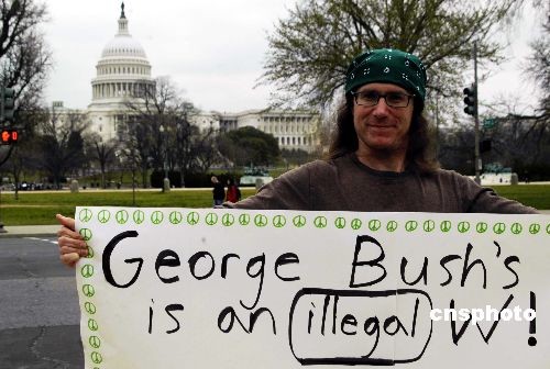 圖為一位示威者舉著的牌子上寫著“布什政府在伊拉克的戰爭是非法的,不道德的”。