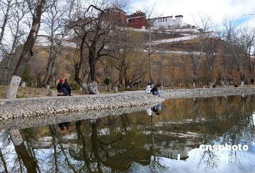 3月20日,拉薩市宗角祿康公園內,情侶們在湖邊享受春光。