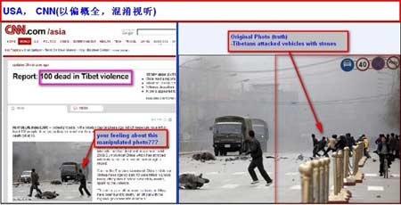 同樣在17日,美國有線電視新聞網(CNN)和法新社在各自網站上使用了一張描述一輛車正向兩名平民駛來的圖片,雖然CNN網站的圖片說明寫的是“藏人向軍車投擲石塊”,但圖中卻看不見類似場景。事實上,當時軍車旁有約10名暴徒在向軍車投擲石塊,只是CNN和法新社未選取這種客觀描述暴徒惡行的照片。