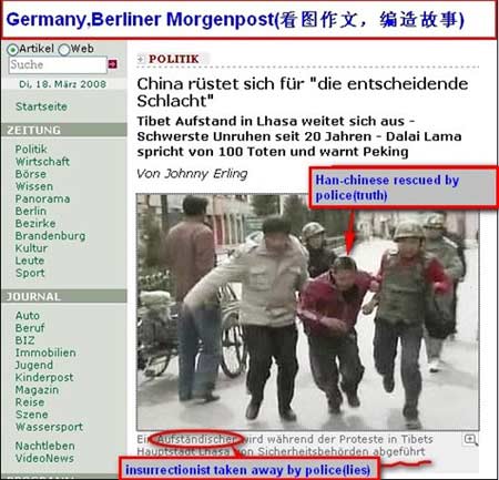 類似的“張冠李戴”還有不少。德國《柏林晨報》網站18日將一張西藏公安武警解救被襲漢族人的照片硬說成是在抓捕藏人;美國?怂闺娨暸_網站刊登圖片稱,中國軍人將藏人抗議者拉上卡車,可圖片中明明是印度警察。德國NTV電視臺也在報道中將尼泊爾警察抓捕藏人抗議者說成是“發生在西藏的新事件”。