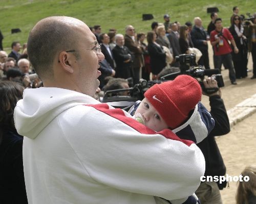 當地時間3月23日,北京奧運圣火采集最后一次彩排在希臘古奧林匹亞遺址舉行,一位父親懷抱不到半歲的嬰兒觀看采集儀式。中新社發 王歡 攝