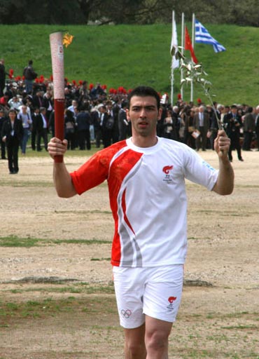 當地時間二十四日上午十一時四十八分,北京奧運圣火在古奧林匹克遺址點燃。最高女祭司在古奧林匹克競技場入口處點燃第一名火炬手、曾獲雅典奧運銀牌的希臘跆拳道運動員亞歷山大·尼克拉澤斯手中的火炬,同時將橄欖枝傳遞給他。亞歷山大舉起第一支燃燒的“祥云”火炬,開啟了北京奧運“點燃激情、傳遞夢想”的火炬傳遞旅程。