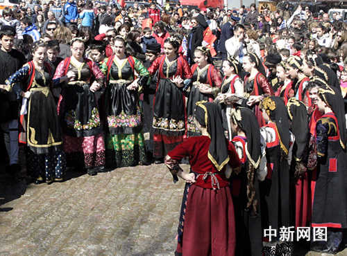 3月26日,北京奧運會圣火希臘境內(nèi)傳遞第三日,抵達冰雪覆蓋的山城邁措翁。青少年跳起希臘傳統(tǒng)舞蹈歡迎奧運圣火。中新社記者 王歡