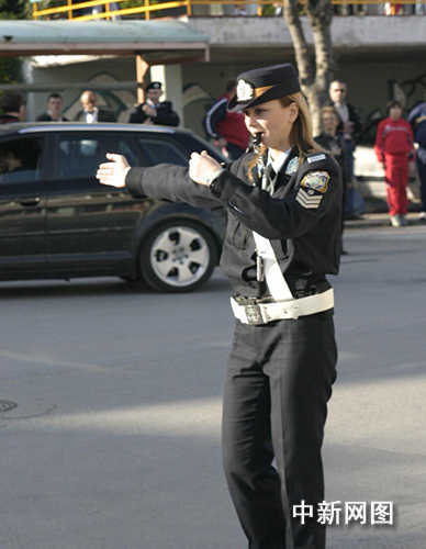 3月26日,北京奧運會圣火希臘境內傳遞第三日,抵達最后一站韋里亞。距離慶典儀式還有一個小時,女交警在輸導交通。中新社記者 王歡