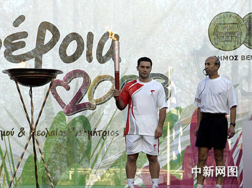 3月26日,北京奧運(yùn)會圣火希臘境內(nèi)傳遞第三日,抵達(dá)當(dāng)天最后一個城市韋里亞。最后一位火炬手希臘手球運(yùn)動員吉米多斯點(diǎn)燃了圣火盆。中新社記者 王歡