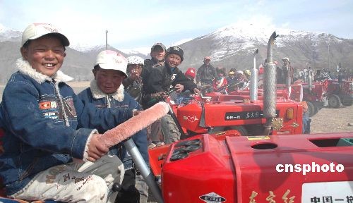 拉薩市達(dá)孜縣德慶鎮(zhèn)桑珠村的農(nóng)牧民子女,喜氣洋洋地坐在政府新支援春耕的拖拉機(jī)上。中新社發(fā) 周波 攝