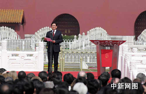 3月31日,北京奧運會圣火歡迎儀式暨傳遞啟動儀式在北京天安門廣場啟動。圖為北京市委書記、北京奧組委主席劉淇在儀式上致辭。中新社發 張宇 攝