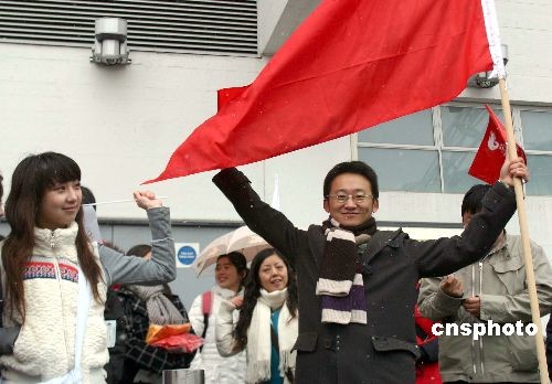 圖為中國留學生在溫布利體育場外為奧運圣火助威。 沈晨 攝