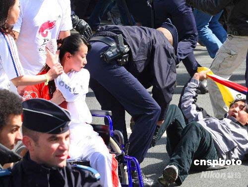4月7日,奧運火炬手金晶在北京奧運會火炬接力巴黎站的傳遞活動中奮力保護火炬。賈婷 攝